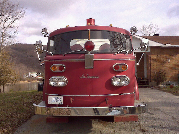 The guy that bought it, a handyman who lives in the country, thought it was would be a good idea to have an antique firetruck — see, he has twin 3-year old boys and figured they’d have all kinds of fun with it. I made sure he had informed his spouse before committing to it. I had to get a flatbed truck to pick it and deliver it the 50 km distance in the country. He arrived late on a rainy Saturday near dinner time. I followed him for the journey, feeling quite sad to see her go. She looked graceful but awkward riding on the back of the flatbed — perhaps even somewhat embarassed.