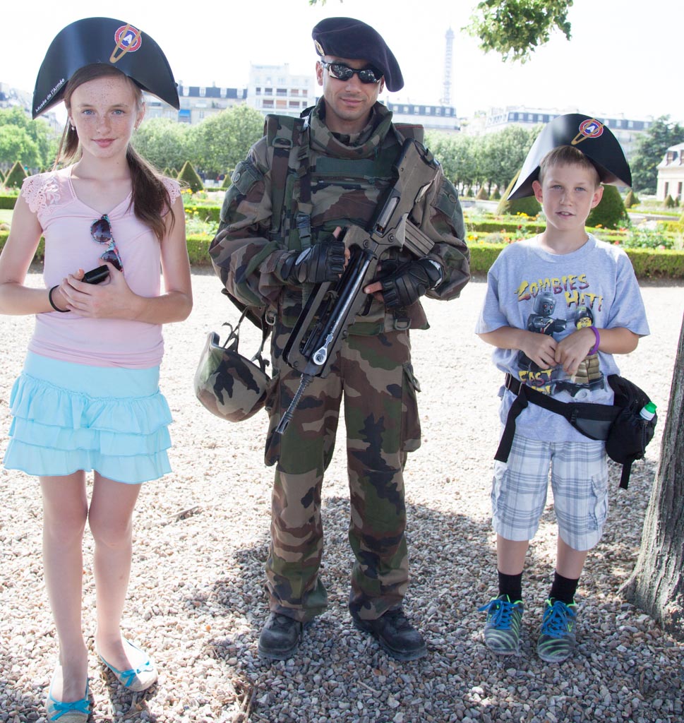 This soldier, however, took time to reassure two worried little tourists that soldiers can be cuddly too. After seeing them nervously scoot by him, he called out “Vous voulez une photo?” “Hell yeah,” they said (in their own child-lingo, And I, of course, smiled and decided to place my trust fully in the training given these young soldiers, trusting that neither of my kids would get accidentally….well, you know. And, in case you are wondering, no…my daughter is not really as tall as this soldier…but yes, he might have been the runt of the litter.